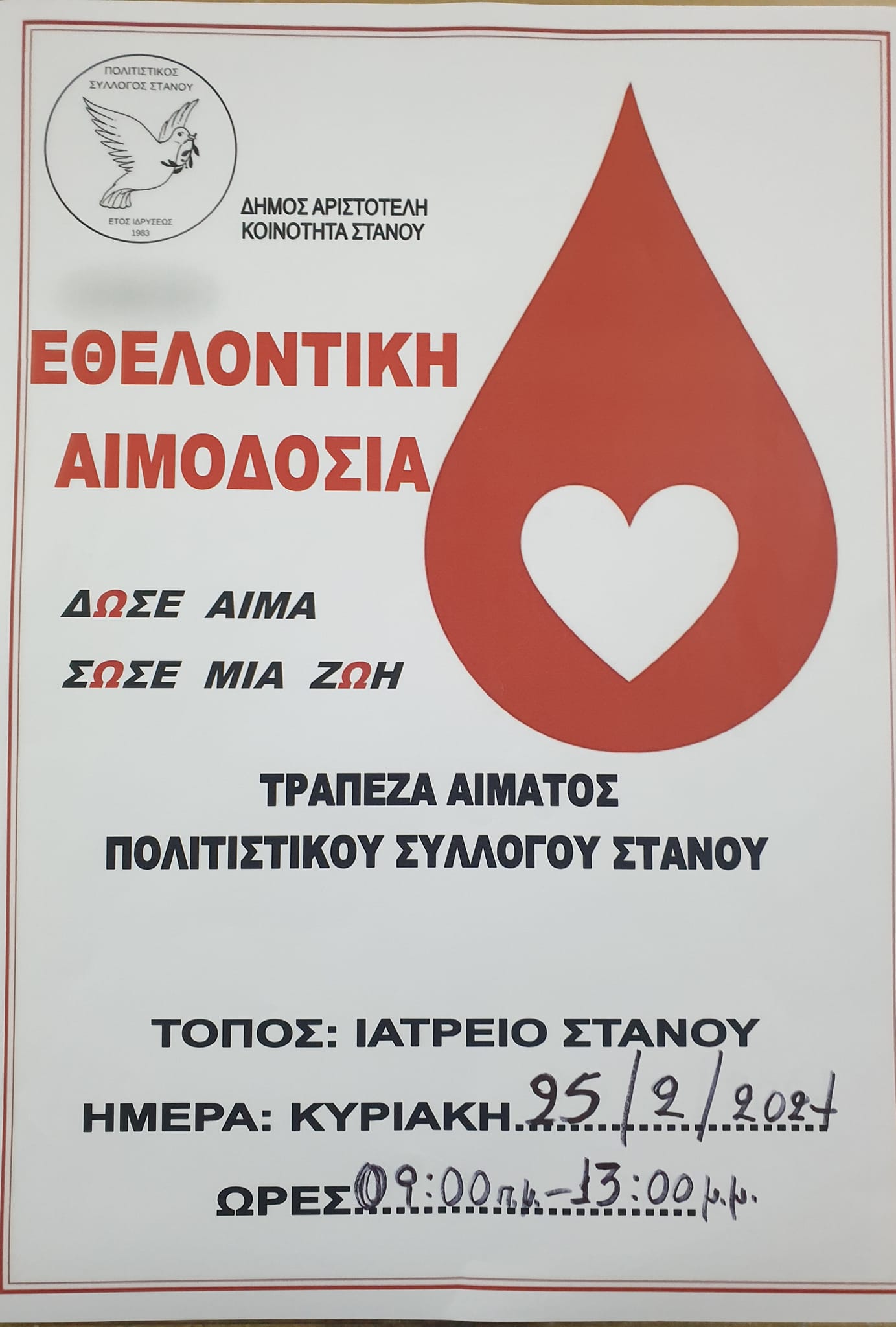 Εθελοντική Αιμοδοσία στην Κοινότητα Στανού την Κυριακή 25 Φεβρουαρίου 2024