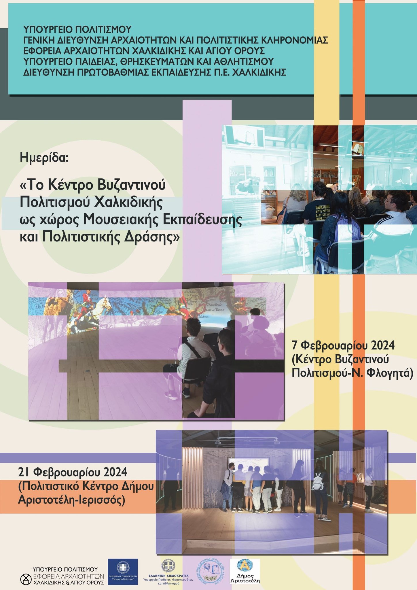 Η Εφορεία Αρχαιοτήτων Χαλκιδικής και Αγίου Όρους σε συνεργασία με τη Διεύθυνση Πρωτοβάθμιας Εκπαίδευσης Χαλκιδικής, οργανώνει δύο Επιμορφωτικές Συναντήσεις με σκοπό την ενημέρωση των εκπαιδευτικών για τις τρέχουσες εκθέσεις και τις νέες εκπαιδευτικές δράσεις της Εφορείας Αρχαιοτήτων Χαλκιδικής και Αγίου Όρους στο Κέντρο Βυζαντινού Πολιτισμού στα Ν. Φλογητά Χαλκιδικής. Στην επιμορφωτική συνάντηση θα συμμετέχουν οι Σύμβουλοι Εκπαίδευσης και θα παρουσιαστούν δύο επιπλέον σχετικές εκπαιδευτικές προτάσεις από ομάδες εκπαιδευτικών.