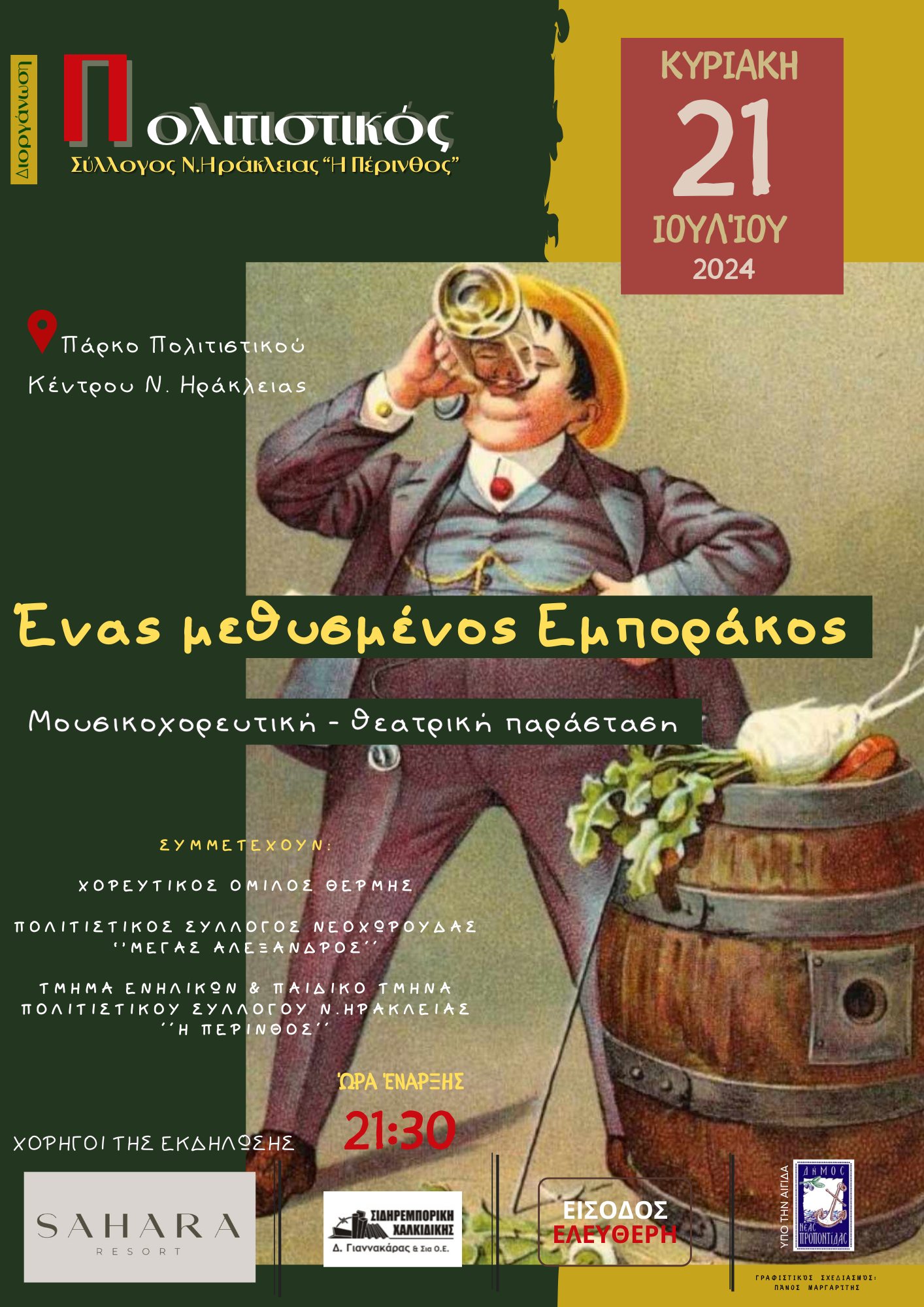 O Πολιτιστικός Σύλλογος Νέας Ηράκλειας ‘’ Η Πέρινθος’’ σας προσκαλεί την Κυριακή 21 Ιουλίου στις 21:30 στη μουσικοχορευτική – θεατρική παράσταση ‘’Ένας μεθυσμένος Εμποράκος’’ στο πάρκο Πολιτιστικού Κέντρου Νέας Ηράκλειας.