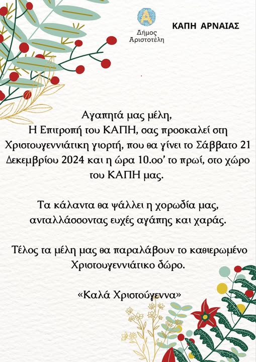 Η Επιτροπή του ΚΑΠΗ, σας προσκαλεί στη Χριστουγεννιάτικη γιορτή, που θα γίνει το Σάββατο 21 Δεκεμβρίου 2024 και η ώρα 10.00′ το πρωί, στο χώρο του ΚΑΠΗ μας.