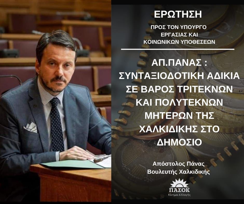Ερώτηση προς την Υπουργό Εργασίας και Κοινωνικών Υποθέσεων κατέθεσε ο Βουλευτής ΠΑΣΟΚ-Κινήματος Αλλαγής Χαλκιδικής και Τομεάρχης Ψηφιακής Διακυβέρνησης του Κόμματος μαζί με τον συνάδελφό του Βουλευτή Αθηνών και Τομέαρχη Εργασίας του ΠΑΣΟΚ κ. Χρηστίδη Παύλο, σχετικά με τη συνταξιοδοτική αδικία που υφίστανται οι τρίτεκνες και πολύτεκνες μητέρες που υπηρετούν στο Δημόσιο και έχουν συμπληρώσει 20 έτη ασφάλισης έως τις 31-12-2010.