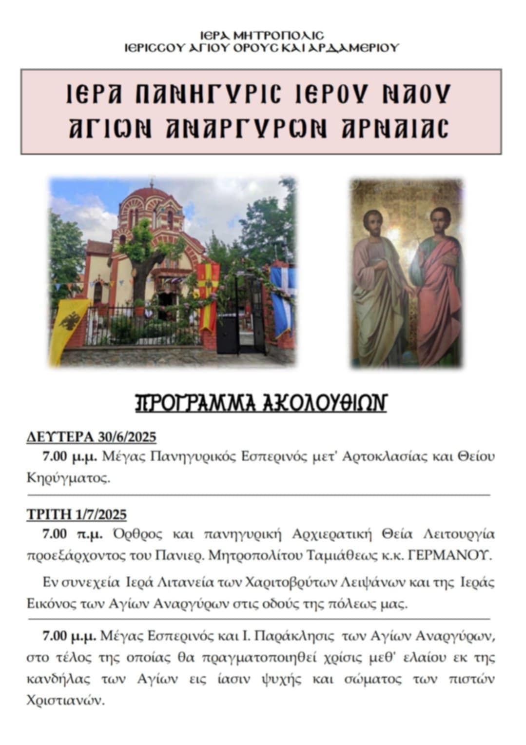 Η Ιερά Μητρόπολις Ιερισσού, Αγίου Όρους και Αρδαμερίου ανακοινώνει με ευλάβεια την Ιερά Πανήγυρι του Ιερού Ναού Αγίων Αναργύρων στην Αρναία, προς τιμήν των θαυματουργών Αγίων. Οι λατρευτικές εκδηλώσεις θα ξεκινήσουν τη Δευτέρα 30 Ιουνίου 2025 και θα κορυφωθούν την Τρίτη 1 Ιουλίου 2025, περιλαμβάνοντας πανηγυρικό Εσπερινό, Αρχιερατική Θεία Λειτουργία προεξάρχοντος του Πανιερ. Μητροπολίτου Ταμιάθεως κ.κ. ΓΕΡΜΑΝΟΥ, Ιερά Λιτανεία, καθώς και Ιερά Παράκληση με χρίση ελαίου, προσκαλώντας τους πιστούς να συμμετάσχουν στις πνευματικές αυτές ευκαιρίες.