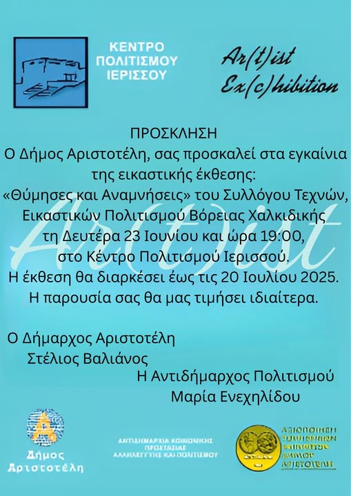 Περιοδικές Εκθέσεις Καλλιτεχνών στο Κέντρο Πολιτισμού Ιερισσού Έναρξη: 23 Ιουνίου 2025