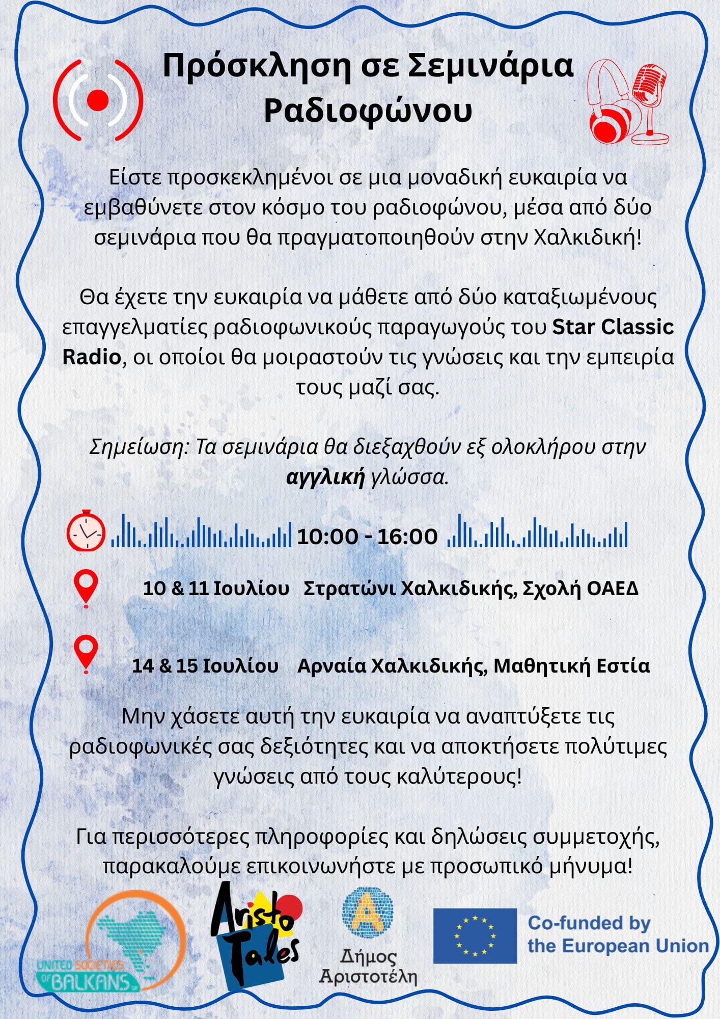 Τα σεμινάρια συνδιοργανώνονται από τους φορείς AristoTales και United Societies of Balkans, σε συνεργασία με τον StarClassic Radio, και με την υποστήριξη του Δήμου Αριστοτέλη, στο πλαίσιο του ευρωπαϊκού προγράμματος European Solidarity Corps.