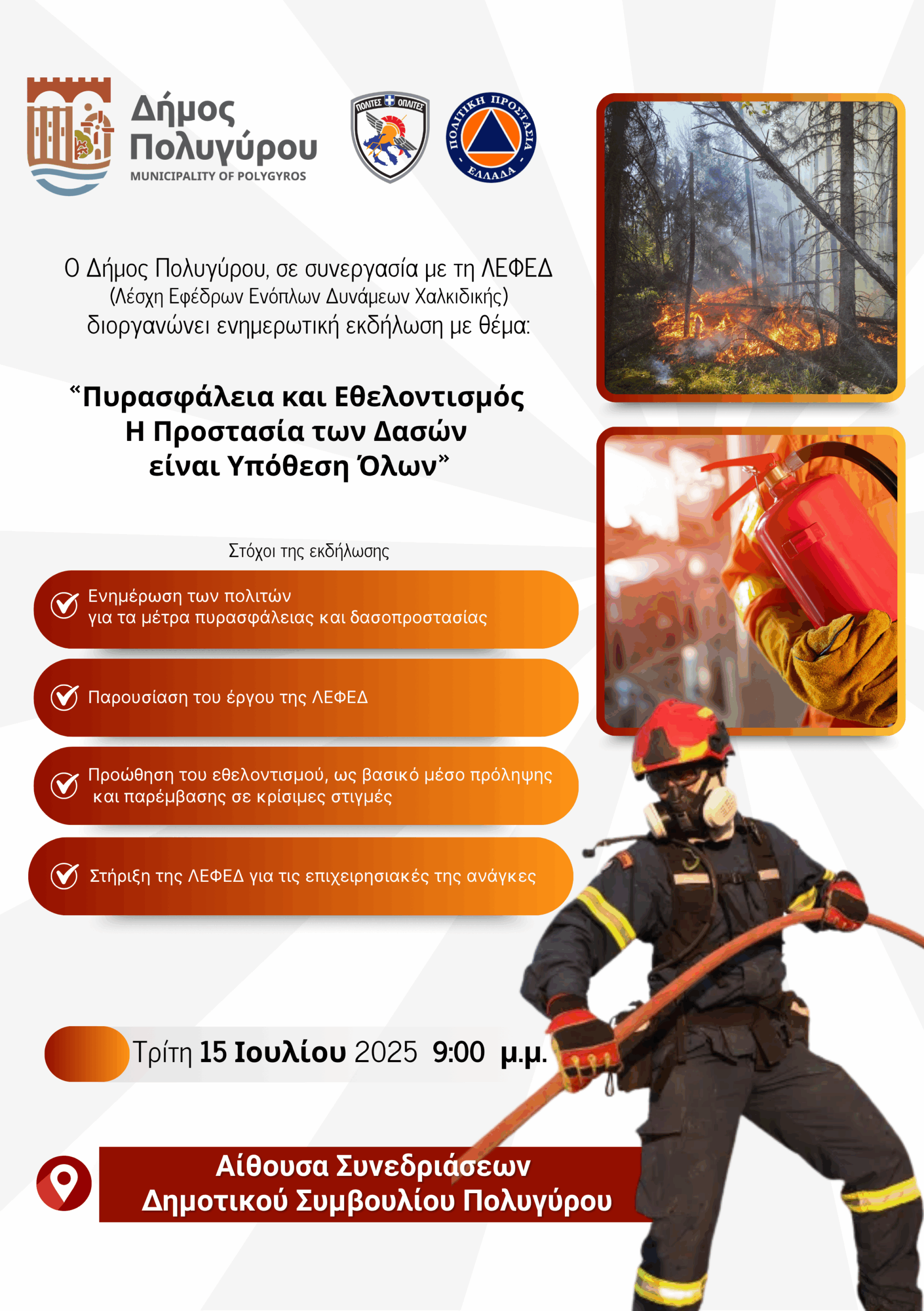 Ο Δήμος Πολυγύρου, αναγνωρίζοντας τη σημασία της πρόληψης και της ετοιμότητας απέναντι στον κίνδυνο των δασικών πυρκαγιών, σε συνεργασία με τη ΛΕΦΕΔ (Λέσχη Εφέδρων Ενόπλων Δυνάμεων) διοργανώνει ενημερωτική εκδήλωση με θέμα: «Πυρασφάλεια και Εθελοντισμός – Η Προστασία των Δασών είναι Υπόθεση Όλων» την Τρίτη 15 Ιουλίου 2025, στις 9:00 το βράδυ, στην αίθουσα συνεδριάσεων του Δημοτικού Συμβουλίου Πολυγύρου.