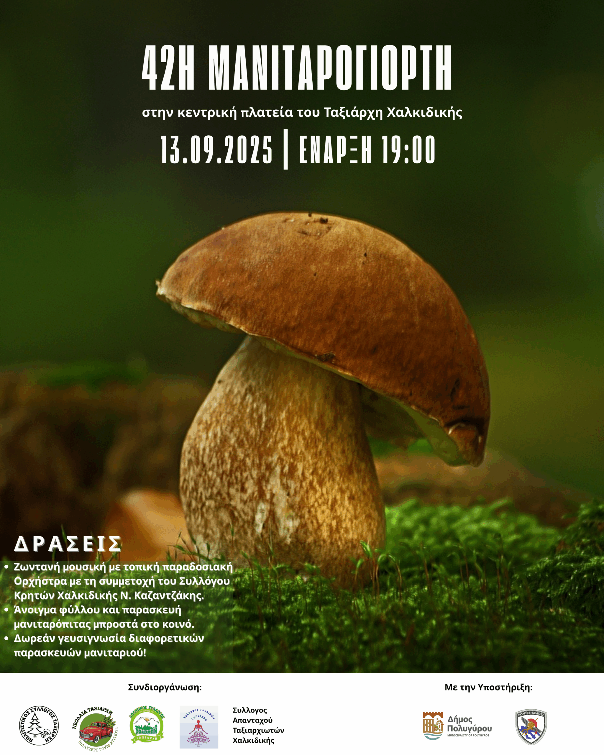 Η φετινή Μανιταρογιορτή διοργανώνεται συλλογικά από όλους τους φορείς και συλλόγους του Ταξιάρχη, σε ένα πνεύμα συνεργασίας και συμμετοχής που αποτελεί σημείο αναφοράς για την τοπική κοινωνία, με την υποστήριξη του Δήμου Πολυγύρου.