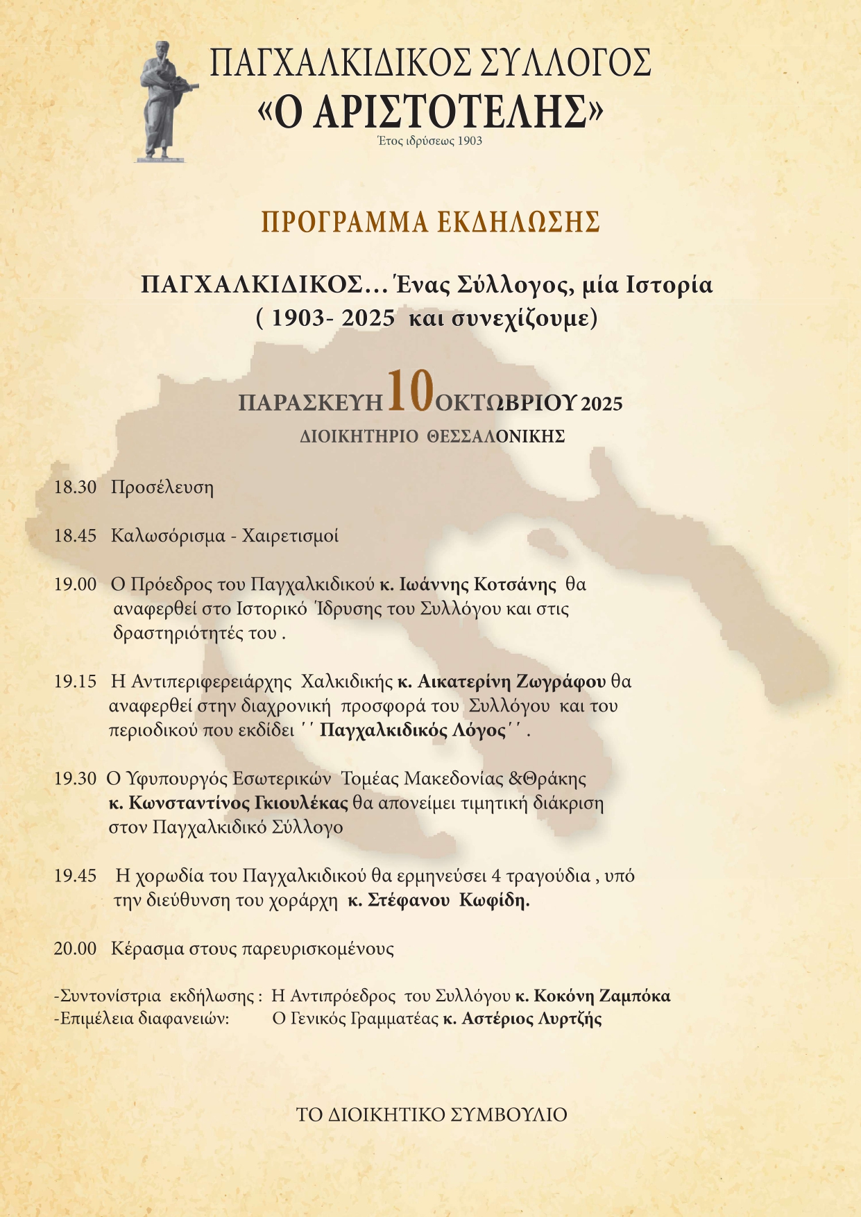 Με αίσθημα υπερηφάνειας και συγκίνησης, ο Παγχαλκιδικός Σύλλογος «Ο Αριστοτέλης», ο ιστορικότερος σύλλογος των Χαλκιδικιωτών, διοργανώνει μια ξεχωριστή εκδήλωση με τίτλο: