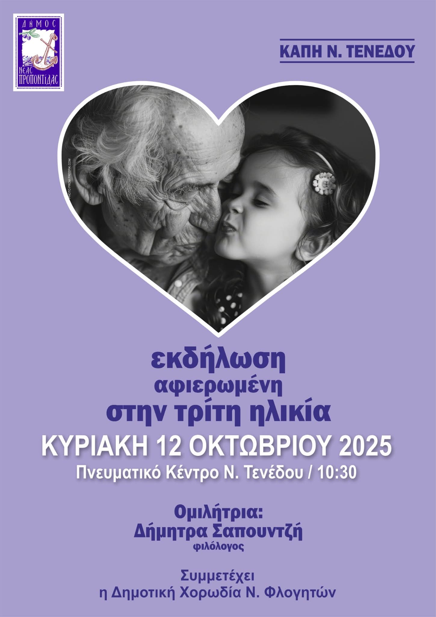 Ο Δήμος Νέας Προποντίδας και το ΚΑΠΗ Ν. Τενέδου διοργανώνουν μια όμορφη και συγκινητική εκδήλωση αφιερωμένη στους ανθρώπους της Τρίτης Ηλικίας, την Κυριακή 12 Οκτωβρίου 2025, στις 10:30 π.μ., στο Πνευματικό Κέντρο Ν. Τενέδου.