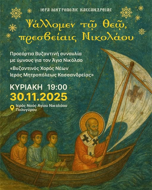 Μια κατανυκτική μουσική εκδήλωση θα πραγματοποιηθεί την Κυριακή 30 Νοεμβρίου 2025, στις 19:00, στον Ιερό Μητροπολιτικό Ναό Αγίου Νικολάου Πολυγύρου, ανοίγοντας το προεόρτιο κλίμα της μεγάλης πανηγύρεως του Πολιούχου της πόλης.