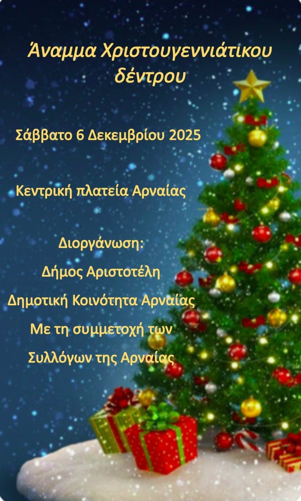 Η πιο όμορφη και γιορτινή εποχή του χρόνου πλησιάζει και η Αρναία ετοιμάζεται να φορέσει τα λαμπερά της στολίδια! Το Σάββατο 6 Δεκεμβρίου 2025, στην κεντρική πλατεία της πόλης, θα πραγματοποιηθεί το παραδοσιακό άναμμα του Χριστουγεννιάτικου δέντρου, σηματοδοτώντας την έναρξη των εορταστικών εκδηλώσεων.