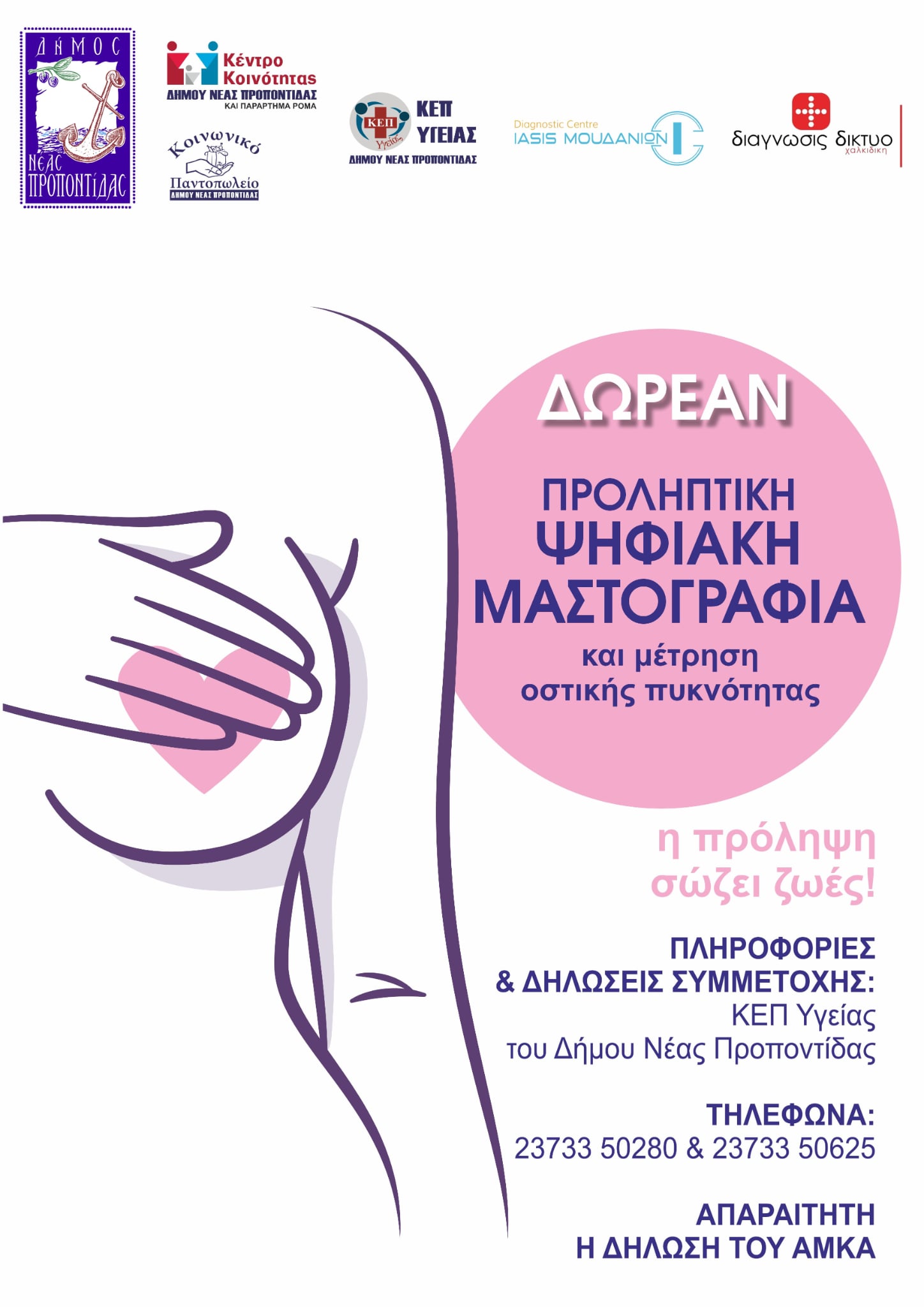 Ο Δήμος Νέας Προποντίδας, σε συνεργασία με τα διαγνωστικά κέντρα IASIS και ΔΙΑΓΝΩΣΙΣ ΔΙΚΤΥΟ στα Ν. Μουδανιά, υλοποιεί δράση δωρεάν προληπτικής ψηφιακής μαστογραφίας μέσω του Προγράμματος «Σπ. Δοξιάδης».